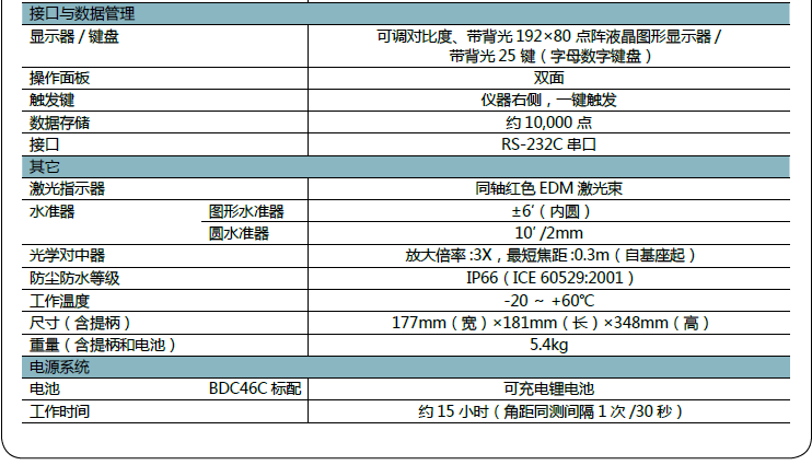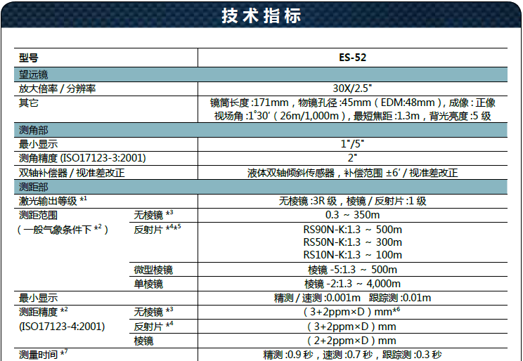 ● ES-52 所具有的編碼器能夠保證在持續(xù)測量條件下角度的可靠性。雙軸補償器能夠保證儀器在地形惡劣的環(huán)境下仍精確水平